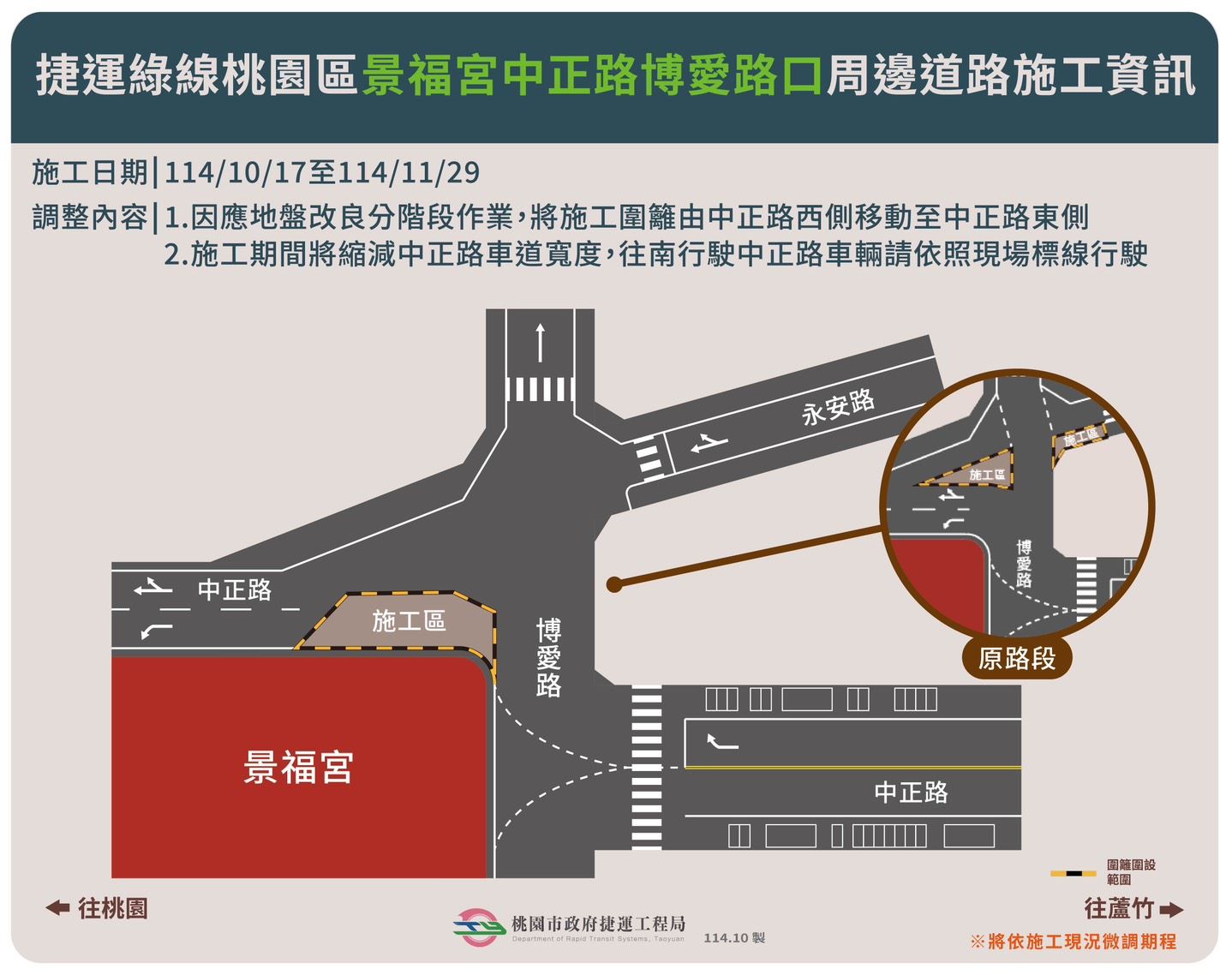 桃園區景福宮周邊進行捷運施工縮減道路,請駕駛人減速慢行