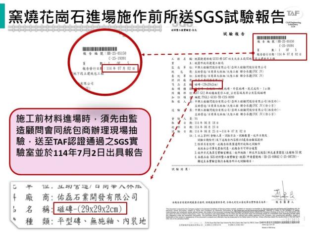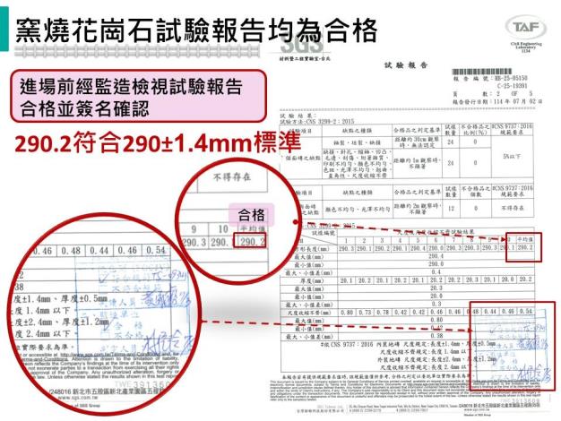 另週刊所述崗石地磚試驗報告送審資料顯示長度/寬度平均為:289.6mm,均小於290x290mm,大小不一,查監造顧問公司實質審查的項目,主要是公司登記、商業登記、同業工會會員證、工廠登記證、無退票證明、工程實績等,週刊所述試驗報告係廠商自行所提供之佐證資料,並非審查要件。施工前材料進場時,須先由監造顧問會同統包商辦理現場抽驗,送至TAF認證通過之SGS實驗室並於114年7月2日出具報告,其長度平均值為290.2mm,另依CNS 9737規定其容許誤差長度為±1.4mm,經統包商及監造顧問審核符合契約規定,與廠商自行提送資格文件內所附之試驗報告無關。