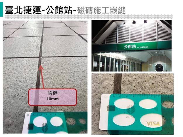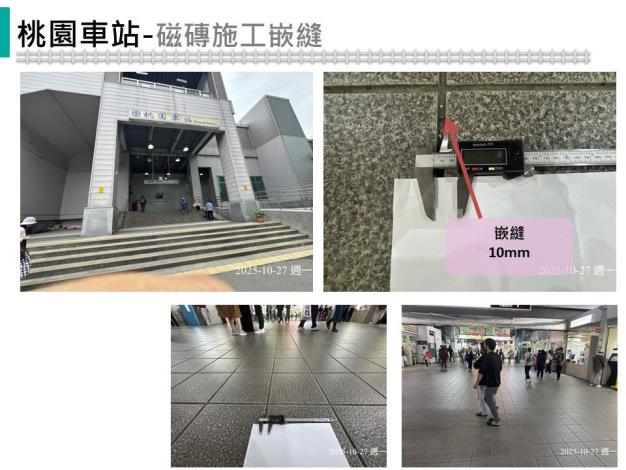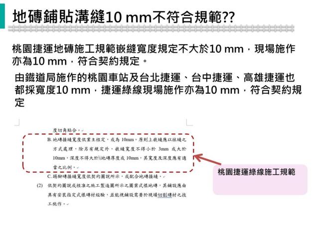 週刊所指地磚鋪貼溝縫10mm不符規範6mm,疑似涉及圖利廠商1,000萬元。實為桃園捷運地磚施工規範溝縫寬度規定不大於10mm,施工圖說及現場施作亦為10mm,符合契約規定,台北、新北、台中及高雄等國內各捷運站,台鐵桃園車站地磚溝縫慣例也都採寬度10mm方式施工,記者所謂圖利廠商乙節,實屬無稽。