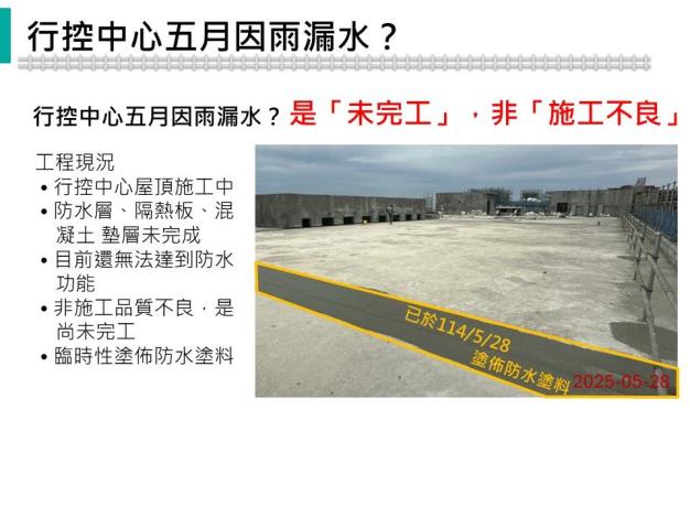 (3)預計於明年1月完成頂樓防水層、隔熱版及混凝土墊層等防水工程,未完成前會持續注意有無滲水及進行相關防滲補強,確保施工品質。