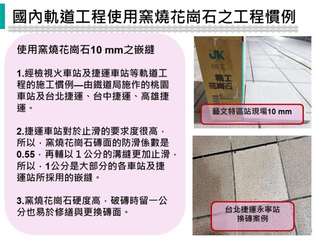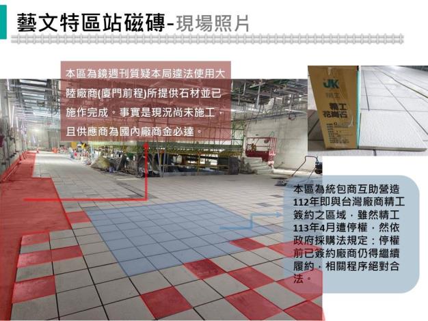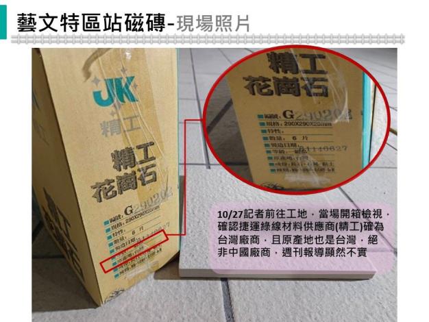 (一)週刊指控捷運綠線採用中國石材(地磚)且業主急補文件護航乙節,本局再次澄清,GC03標石材絕無採用大陸石材,整起過程之實情為:GC03標承包商互助營造之下包商佑磊於施工前提送原核定石材供應商為廈門前程公司,經捷運綠線統包商發現廈門前程公司產品為大陸製後,已於114年6月5日主動更換為國內廠商,並無使用廈門前程公司所提供大陸製之材料。另查,鏡週刊報導引用照片為車站中間已鋪設的「崗石地磚」,並非「石材」,而該崗石地磚供應商為台灣的精工陶瓷公司,並非大陸廠商。車站公共區域地面外圍收邊,未來才會使用「石材」,目前既無施工石材,何來大陸製石材?惟27日與28日用穿堂層之不同地點(角度)所拍攝照片,影射本局移置部分材料且去向不明,建議鏡週刊提供「移置前照片」釐清真相,而不是用揣測來抹殺工作人員辛勤的付出。