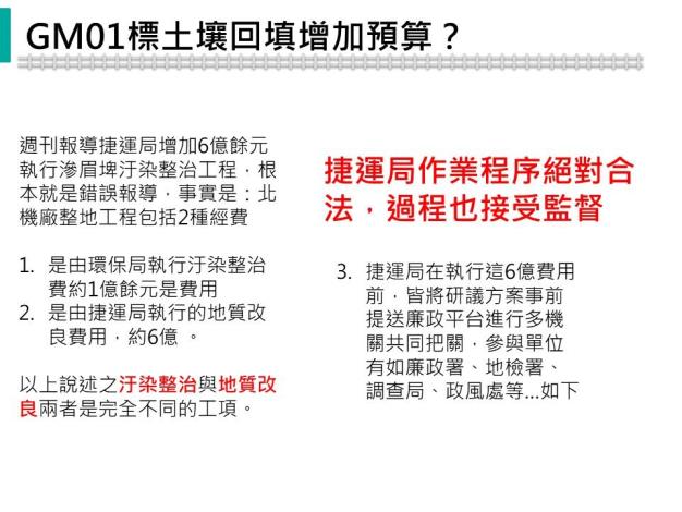 2.桃園捷運綠線機廠由G14(原G13a)站旁農地移至滲眉埤,滲眉埤為重金屬管制區,其原土為受管制不可外運,經當時環保局編列1億多元經費於108年底進行該地區汙染整治,整治方式係以客土稀釋原有土壤,讓汙染物降至管制標準之下所進行之工程,完工後於110年1月5日經公告程序始解除管制,才得以進行其他工程,否則不允許任何土地使用或開發行為,故週刊所述1億元為汙染整治經費,未進行土壤夯壓,無法達到捷運機廠90~95%壓密度需求。