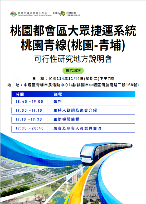 捷運青線為桃園第二階段路網優先推動路線,因路線長度調整,起點自桃園田徑場,終點站由高鐵桃園站延伸增加3座車站至亞洲矽谷創新研發中心,為向市民說明青線路線調整方案、沿線車站規劃及可行性研究進度,桃園市政府捷運工程局將於11月3日及4日加開2場地方說明會,持續與地方溝通並廣納意見,讓捷運建設更貼近民眾需求與地方發展。