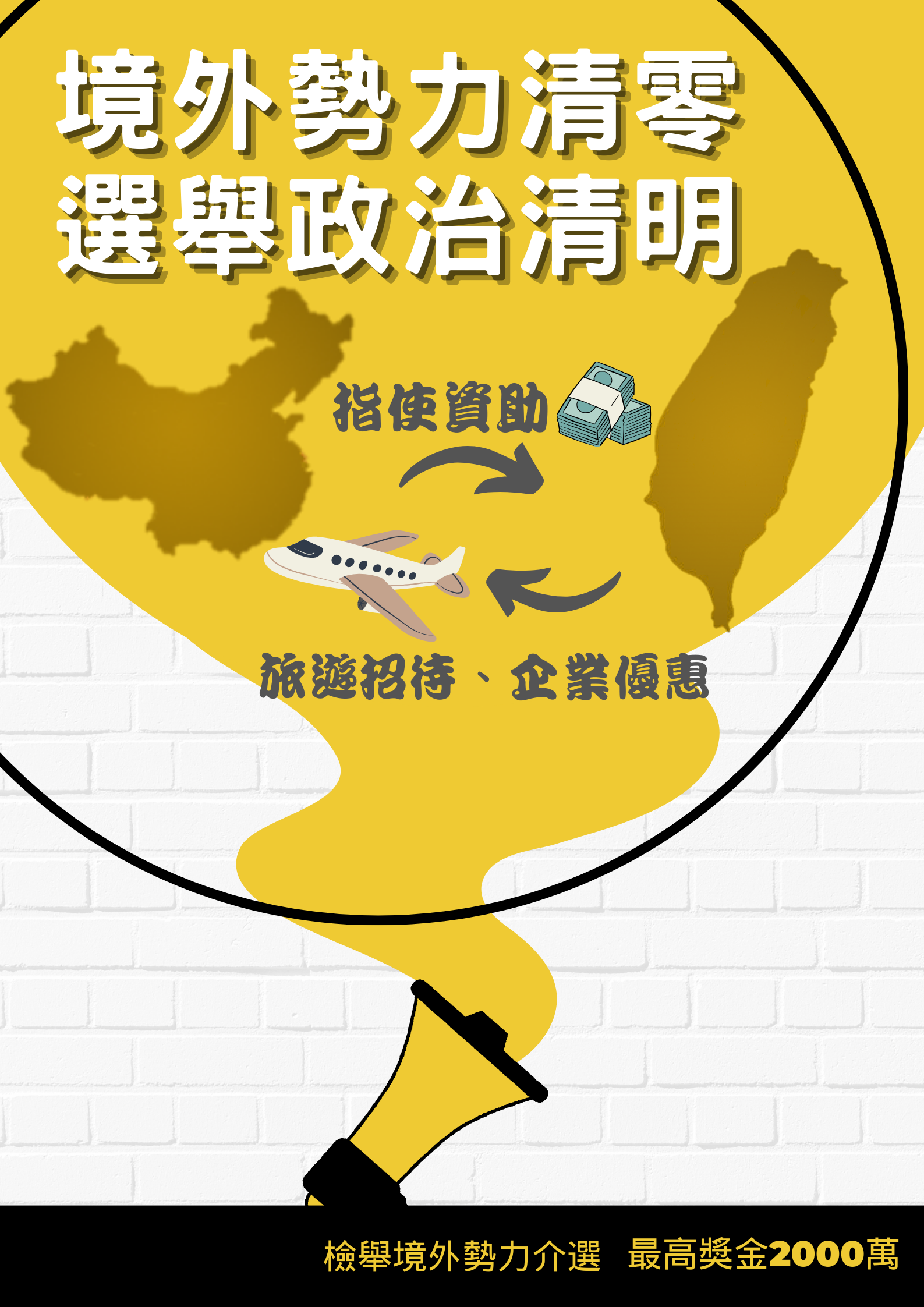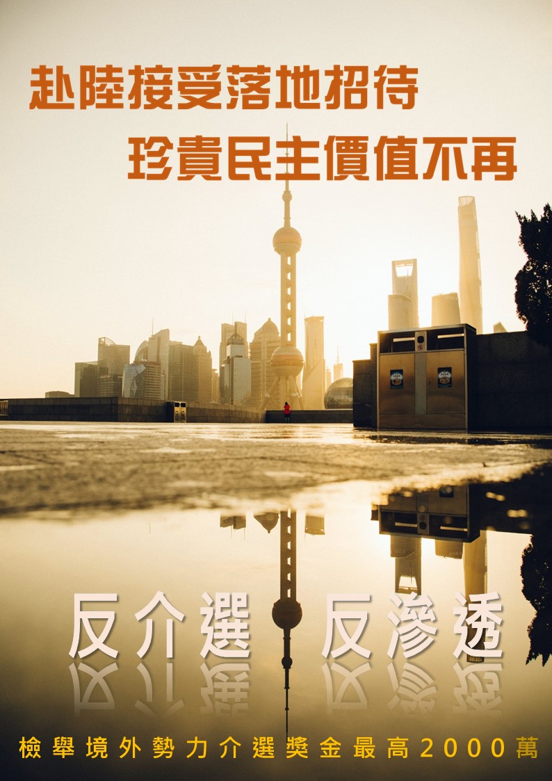 反介選宣導標語 赴陸旅遊要小心,勿拿不明來源金。 赴陸機票換選票,乾淨選風變了調。 赴陸接受落地招待,珍貴民主價值不再。 境外勢力清零,選舉政治清明。 拒絕境外有心款待,捍衛公正公平選風。 反境外勢力介入選舉,赴陸勿接受落地招待。 低價旅遊隱情多,真實目的藏背後,避免投票被左右,免費招待請say no。 我們的未來,不是外來設定的劇本;赴陸拒絕被招待,我們自己來Party。